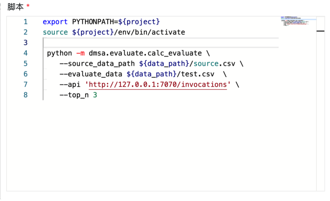python -m dmsa.evaluate.calc_evaluate \--source_data_path ${data_path}/source.csv \--evaluate_data ${data_path}/test.csv \--api 'http://127.0.0.1:7070/invocations' \--top_n 3