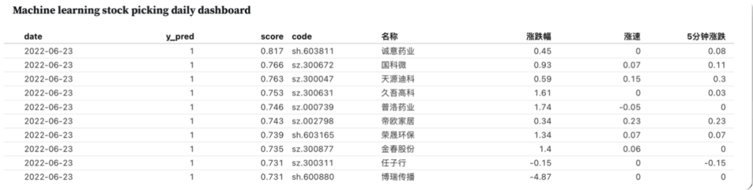 为2022-06-23晚上选出的股票,在2022年6月24的实时表现,包括涨跌幅,涨速等信息The real-time average returns of the top 10 stocks are as follows