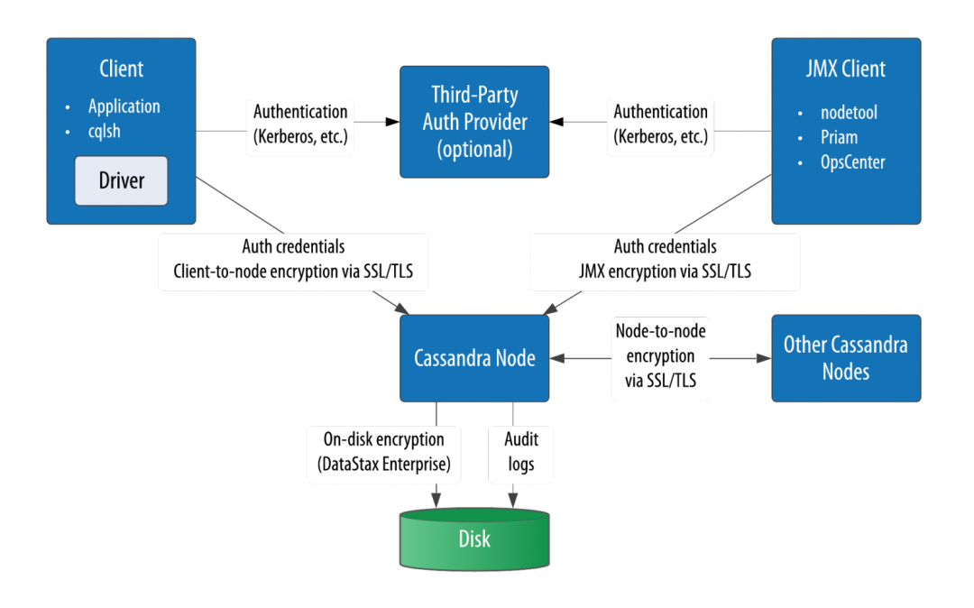 为此,开源Cassandra也提供一定的安全功能包括身份验证,基于角色的授权和加密,以及SSL/TLS加密。如下图所示: