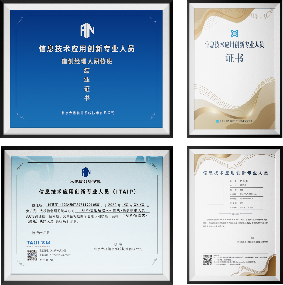 2、通过认证考试,获取太极公司颁发的“信息技术应用创新专业人员-信创经理人研修班-高级决策人员”课程培训结业证书,同时录入太极优秀人才库,获得更多职场推荐机会。