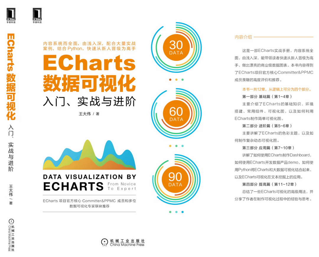 第二部分(第5~6章)为进阶篇,主要介绍ECharts的色彩主题,以及制作复杂动态可视化。