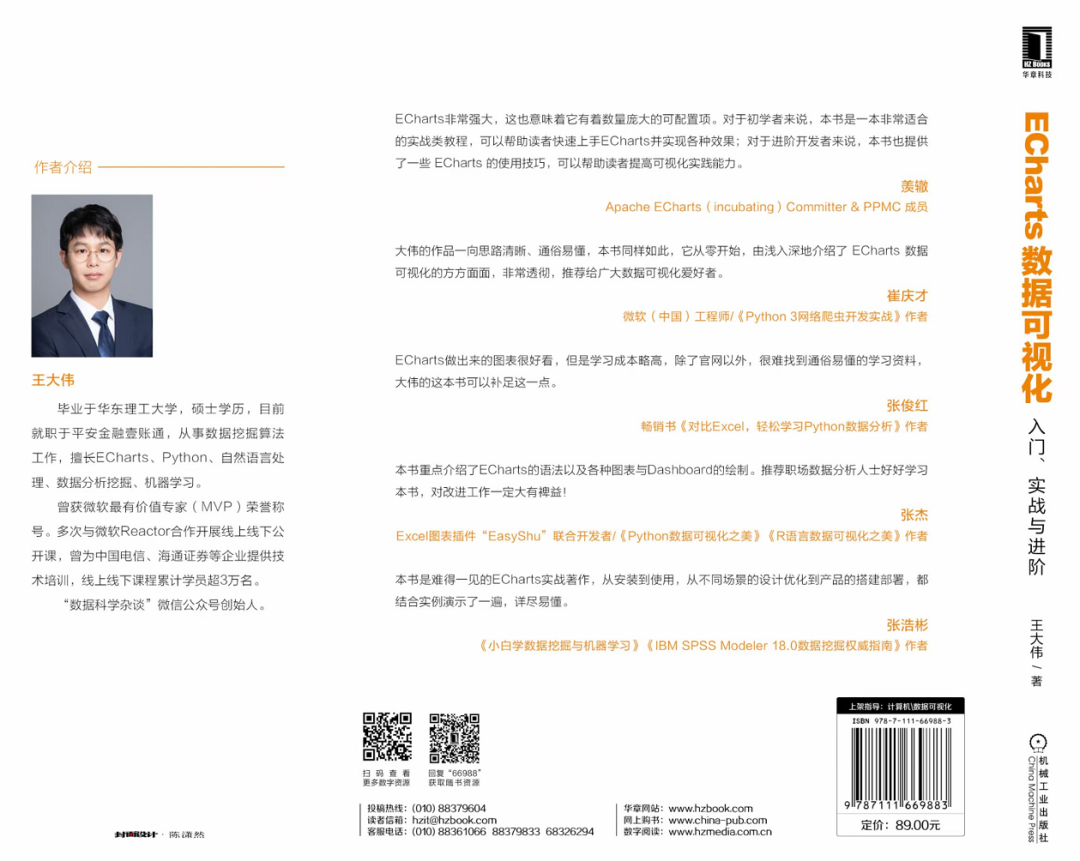 大伟的作品一向思路清晰、通俗易懂,本书同样如此,它从零开始,由浅入深地介绍了 ECharts 数据可视化的方方面面,非常透彻,推荐给广大数据可视化爱好者。
