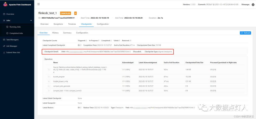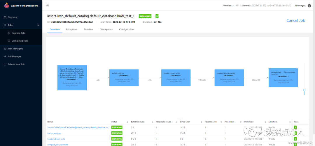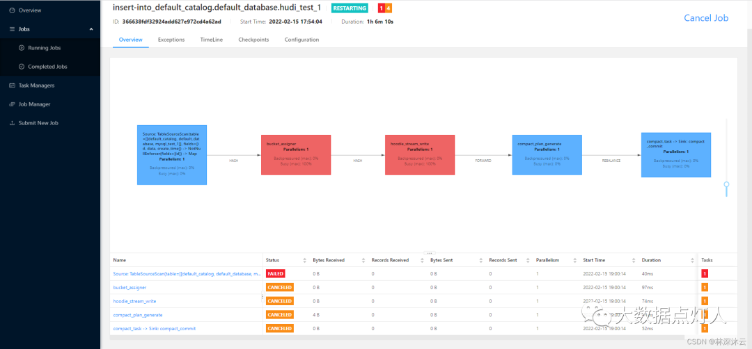 Flink SQL> set execution.checkpointing.interval=30sec;##创建flinksql mysqlcdc表Flink SQL> create table mysql_test_1(id bigint primary key not enforced,data String,create_time Timestamp(3)) with ('connector'='mysql-cdc','hostname'='192.168.2.101', --从从库1开始同步,切换为主库或从库2时修改为对应的ip'port'='3306','server-id'='5600-5604','username'='user_test','password'='user_test_password','server-time-zone'='Asia/Shanghai','debezium.snapshot.mode'='initial','database-name'='flink_cdc','table-name'='test_1')##创建flinksql hudi表Flink SQL> create table hudi_test_1(id bigint,data String,create_time Timestamp(3),PRIMARY KEY (`id`) NOT ENFORCED)with('connector'='hudi','path'='hdfs:///tmp/flink/cdcata/hudi_test_1','hoodie.datasource.write.recordkey.field'='id','hoodie.parquet.max.file.size'='268435456','write.precombine.field'='create_time','write.tasks'='1','write.bucket_assign.tasks'='1','write.task.max.size'='1024','write.rate.limit'='30000','table.type'='MERGE_ON_READ','compaction.tasks'='1','compaction.async.enabled'='true','compaction.delta_commits'='1','compaction.max_memory'='500','changelog.enabled'='true','read.streaming.enabled'='true','read.streaming.check.interval'='3','hive_sync.enable'='true','hive_sync.mode'='hms','hive_sync.metastore.uris'='thrift://hiveserver2:9083','hive_sync.db'='test','hive_sync.table'='hudi_test_1','hive_sync.username'='flinkcdc','hive_sync.support_timestamp'='true');##启动flink作业Flink SQL> set pipeline.name = flinkcdc_test_1;Flink SQL> set execution.checkpointing.externalized-checkpoint-retention= RETAIN_ON_CANCELLATION;Flink SQL> insert into hudi_test_1 select * from mysql_test_1;