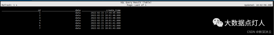mysql> use flink_cdc;mysql> CREATE TABLE `test_1` (`id` bigint(20) NOT NULL AUTO_INCREMENT,`data` varchar(10) DEFAULT NULL,`create_time` timestamp NOT NULL DEFAULT CURRENT_TIMESTAMP ON UPDATE CURRENT_TIMESTAMP,PRIMARY KEY (`id`)) ENGINE=InnoDB DEFAULT CHARSET=utf8mb4;## 重复执行,插入多条数据mysql> insert into test_1(data) values('data');