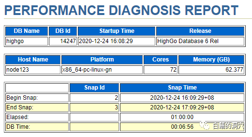 看这个报告头是不是ORACLE DBA都感到十分亲切。实际上以前的华为gaussdb 100 1.0.1版本、达梦数据库也带有一个类似AWR的报告,不过达梦和高斯的报告还是过于简单了。我们来看看highgo 6.0的PDR能不能给大家带来一些惊喜。