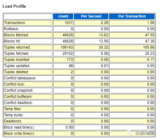 Load Profile是我们分析Oracle数据库的负载必看的内容,从PDR的LOAD PROFILE上,PG核心的一些主要负载信息还是比较完整的,从这些数据上,完全是可以类似oracle一样去评估负载的。不过在Load Profile里明显少了一些东西。我们来对比一下Oracle的Load Profile: