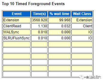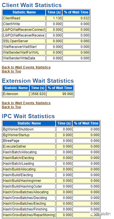 上面三个等待状态,客户端等待状态可以用于分析客户端或者应用的性能与负载情况,extension等待可以用于分析数据文件的扩展情况。IPC WAIT可以用于分析数据库中的进程间通讯是否正常。