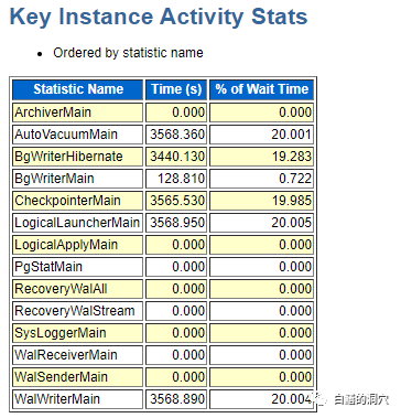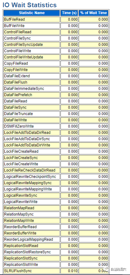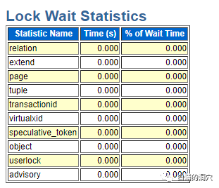 紧接着就是LOCK的等待情况,从中可以分析PG的锁的争用情况,从而用于优化PG配置与应用程序。