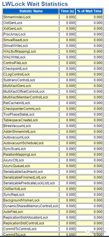 因为我们还没给数据库加压,所以目前的报告里的等待事件数量并不多,不知道加压后会如何。能够在FDR报告里看到等待事件的情况,对于曾经的Oracle DBA来说就太贴心了。不过这里看不到平均等待时间,有点美中不足。不过除了Oracle外,还很少数据库能够把等待事件的等待时间统计的比较完美的,因为这种统计算法十分难写,搞得不好会影响数据库的性能与稳定性。下面是锁的情况分析。PostgreSQL有三种锁,spinlock,lwlock和lock。spinlock是保护内存结构用的(和Oraclelatch类似),采用硬件和操作系统提供的test and set原子操作来实现;LWLock是一种基于spinlock机制实现的轻量级的锁,有互斥、共享、WAIT UNTIL FREE三种锁模式;LOCK是和Oracle enqueue类似的普通锁,用于操作postgresql中的数据对象的。