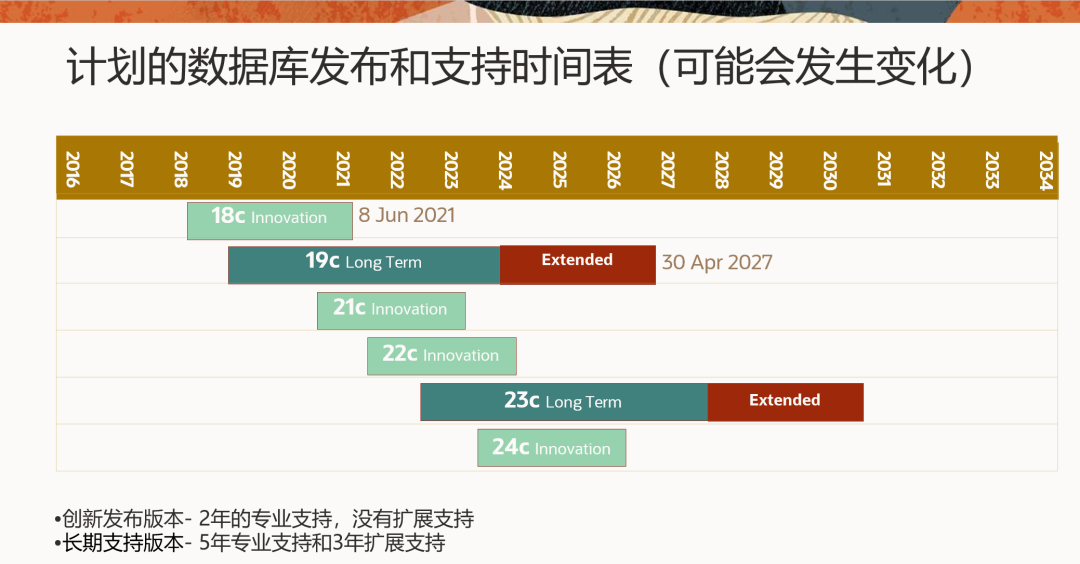 2020年即将过去,我们在憧憬美好2021之时,Oracle即将推出Oracle Database 21c,这是一个innovation版本的数据库,和大家之前了解到的Oracle Database 18c类似,我们为大家提供两年的premier support。通过下面的幻灯片大家可以看到,19c依旧是我们的长服务周期版本数据库,我们将为它提供到2027年的专业支持服务。