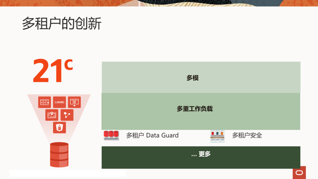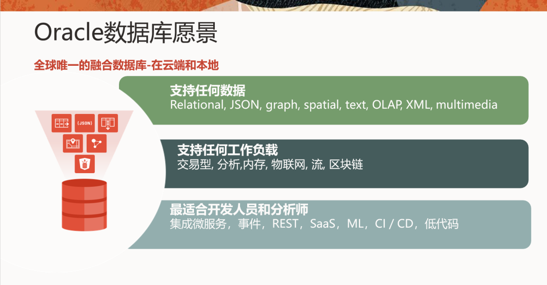 我们在Oracle Database 19c当中提出了很多Converged Database的理念,将多种数据服务都融合在一个数据库当中,关于Converged Database,大家可以通过https://go.oracle.com/LP=89276?elqCampaignId=239796 观看我们每周五上午11:00的网络公开课,在公开课当中已经为大家介绍了很多Converged Database的相关内容。