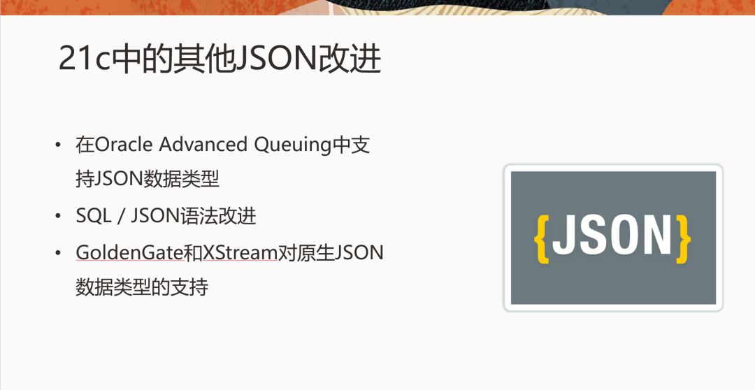 在21c当中,Oracle也带来了更多针对JSON的优化与支持,比如Oracle GoldenGate和XStream对JSON数据类型的支持与使用SQL操作JSON的语法改进等等。