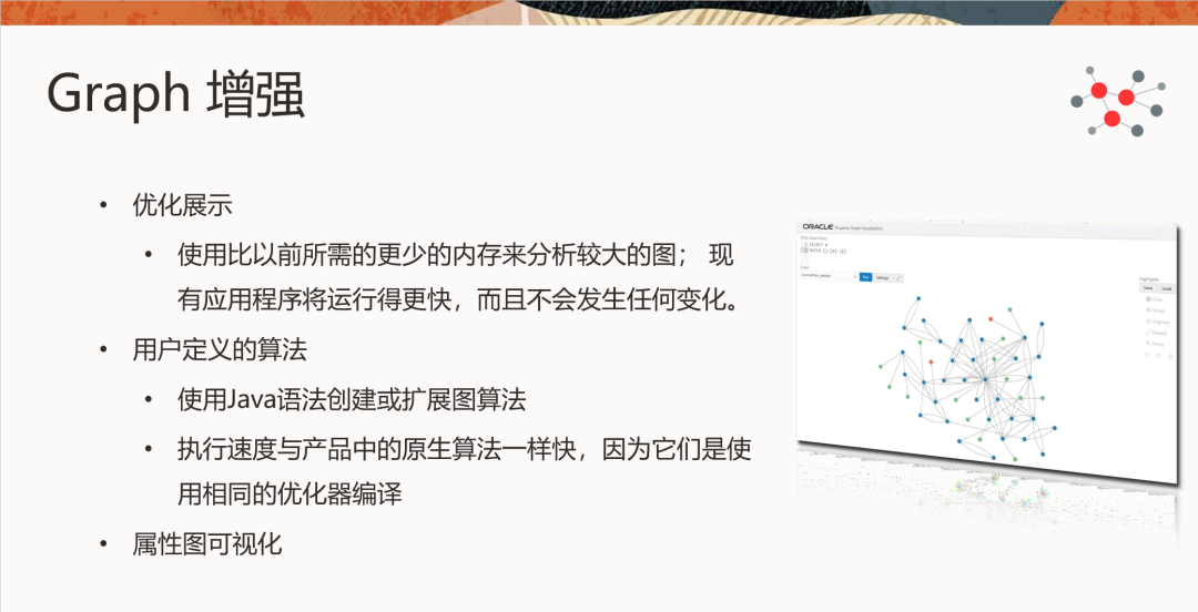 图数据库是一种非关系型数据库,用来解决现有关系数据库的局限性。图模型能够明确地列出数据节点之间的依赖关系,而关系模型和其他NoSQL数据库模型则通过隐式连接来链接数据。图数据库可以简单快速地检索难以在关系型数据库中建模的复杂层次结构。在Oracle Database 21c当中,对于图的支持有了很多增强,比如内存上的优化,之前在现实比较大的图的时候,会消耗很多内存。在21c当中,处理较大的图所需的内存比之前有了明显的下降,从而提升了系统的性能,加快了程序的响应速度,让您的应用程序运行得更加平稳与迅速。同时,在21c当中,支持使用Java的语法方便地创建和扩展您的算法,从而降低了学习成本,加快的程序开发的进度。您可以通过Oracle图可视化工具方便地对Graph进行可视化处理。