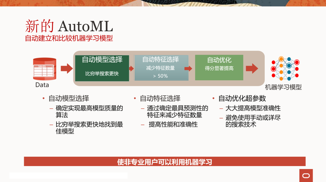 机器学习目前已经深入到我们生活和工作的各个领域,一般我们在使用机器学习的时候,都是先选择模型,然后对模型参数进行调整,训练模型,再对模型的参数进行调整,然后测试模型。这是一个循序渐进的过程,需要花费较多的精力和时间。如果模型选择错误,或者参数调整不当,不但会浪费大量时间,而最后的预测或计算效果也会和目标相差甚远。在Oracle Database当中,当我们给出数据之后,系统会根据数据的情况,选择出最适合的模型,并训练集当中的特征进行最优的特征选择,比较欠拟合和过拟合的情况发生,同时会自动对所选模型的参数进行不断优化调整,直到到达最优。利用Oracle的自动机器学习功能,没有数据科学背景的使用者,也能轻松使用自动机器学习功能进行快速、高效地预测。