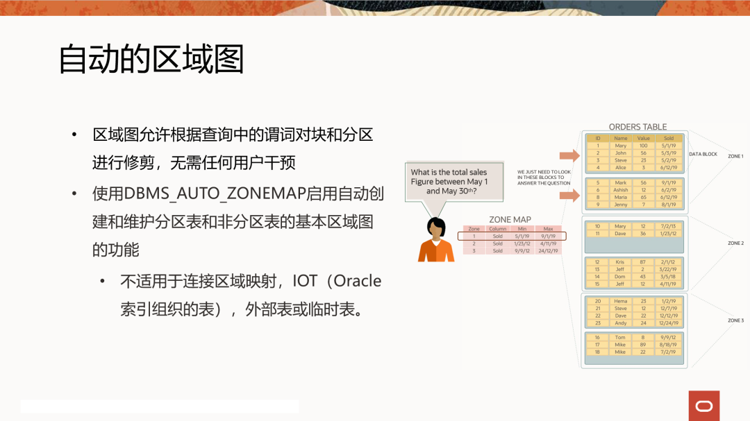 我们在Oracle当中,可以使用多种技术对海量数据快速查询,比如我们经常使用的分区技术,还有在Exadata上使用的存储索引、智能扫描等功能。在21c当中,通过DBMS_AUTO_ZONEMAP开启自动区域图功能,可以根据查询中的谓词对块和分区进行修剪,在不需要用户干预的情况下,加速查询,为我们的用户提供在海量数据当中的快速查询功能。