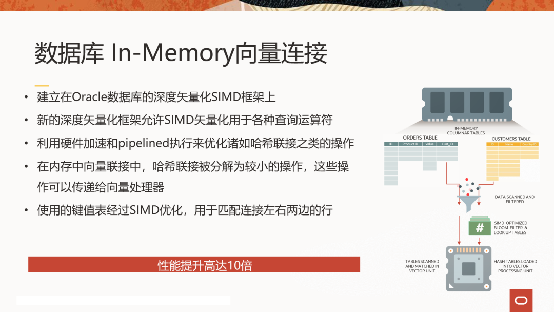 在21c当中,使用内存中的深度向量化优化连接:内存中的深度向量化可以优化复杂的SQL操作符,方法是将每个SQL操作符中的物理操作符流水线化,并使用SIMD技术对它们进行向量化。该特性在默认情况下是启用的。内存中的深度向量化是一个基于SIMD的框架,它支持对查询计划中的高级查询操作符进行向量化。该框架包括SIMD、硬件加速和流水线执行等优化。内存中的向量化连接特性是深度向量化框架的关键。使用SIMD向量处理,框架优化了散列连接的各个方面,如散列、构建、探测和收集。这种优化可以将连接处理的性能提高100%或更多。内存中的向量化连接特性对用户是透明的。这个优化在默认情况下是启用的,但是您可以通过将INMEMORY_DEEP_VECTORIZATION初始化参数设置为false来禁用它。