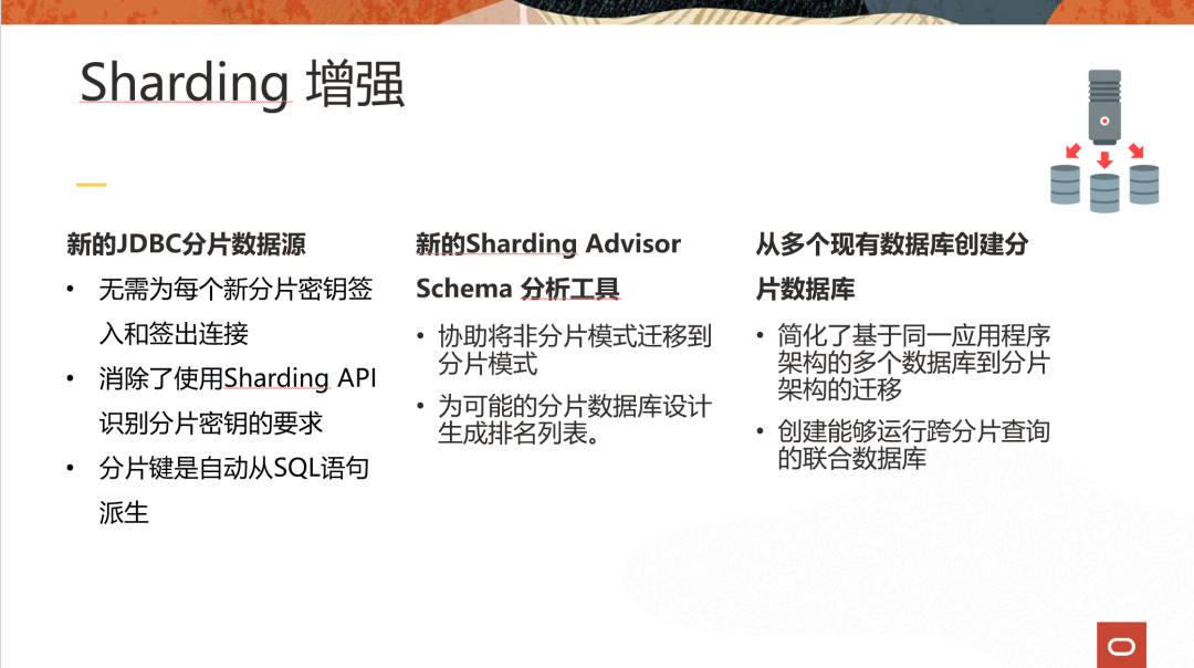 在21c当中利用自动从SQL语句派生出来的分片键,消除使用Sharding API识别分片密钥的需求,并使用全新的Sharding Advisor Schema分析工具,协助将非sharding模式迁移到sharding模式,并提供数据库分析功能,给出哪些数据库应该使用sharding设计的排名列表,方便DBA做决策。并可以从多个现有的非sharding数据库来创建一个sharding数据库,降低了数据库整合的难度,提升了向sharding数据库转换的灵活性。