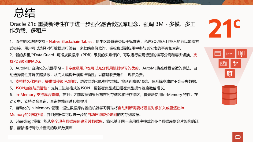 在21c当中,对多种工作负载都有了优化与创新,比如In-Memory组件、持久化内存的支持、自动区域图、自动机器学习、sharding增强等。
