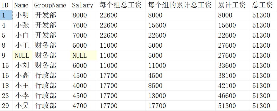SELECT *, SUM(Salary) OVER(PARTITION BY Groupname) 每个组的总工资, SUM(Salary) OVER(PARTITION BY groupname ORDER BY ID) 每个组的累计总工资, SUM(Salary) OVER(ORDER BY ID) 累计工资, SUM(Salary) OVER() 总工资from Employee