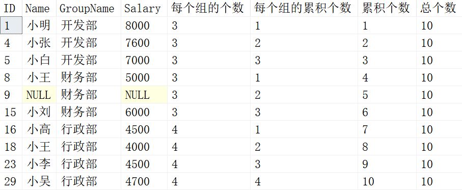 SELECT *, COUNT(*) OVER(PARTITION BY Groupname ) 每个组的个数, COUNT(*) OVER(PARTITION BY Groupname ORDER BY ID) 每个组的累积个数, COUNT(*) OVER(ORDER BY ID) 累积个数 , COUNT(*) OVER() 总个数from Employee