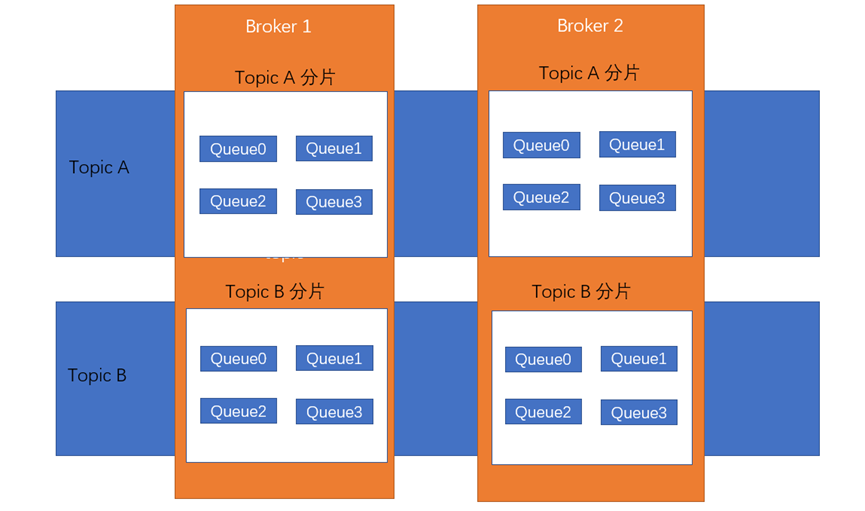 Broker:负责消息的存储、投递和查询以及服务的高可用保证,在实际服务部署中一个Broker对应一台服务器,每个Broker可以有多个Topic,一个Topic也可以分片存储在多个Broker上。