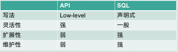 从写法上来说,API方式相对来说更“命令式”些,SQL更加声明式,后者对于开发者来说门槛更低。