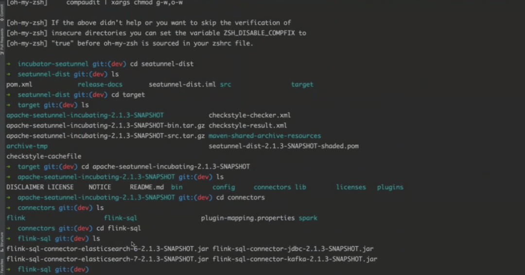 这种实现方式有好处也有缺点,好处是增加connector非常简单,只需要在SeaTunnel connector下的Flink SQL中加入一个Sub-module,包含Flink本身的依赖,打包时把它输出到下图所示地址。
