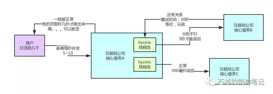 那如果每秒钟过来几百个请求这个服务实例呢?一下子那个线程池里的线程就全部hang死了,没法再响应任何请求了。