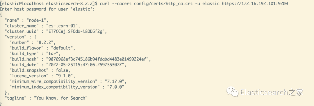 curl --cacert config/certs/http_ca.crt -u elastic https://172.16.192.101:9200