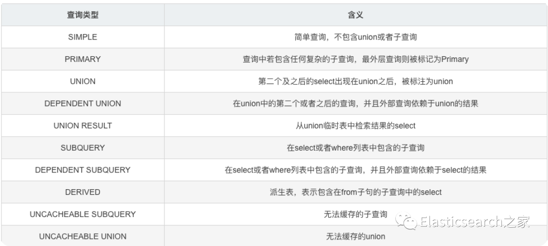 查询类型,用来区分是普通查询还是联合查询或者子查询,从官方文档中我们知道,查询类型分为以下几种: