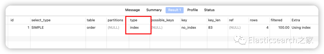 11、index:全索引扫描 当我们需要的数据在索引中就能查找到,或者需要用到索引进行排序时其连接类型就是index,比如:当order表中no字段为索引时,我们只查询该字段,其type就是index