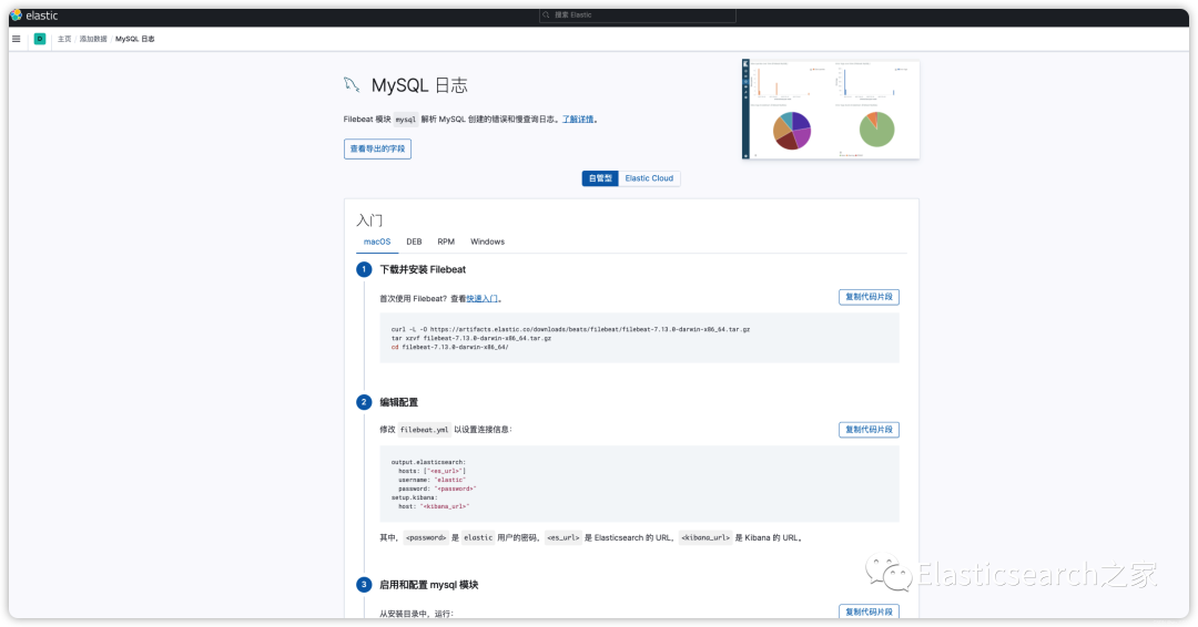 以下安装步骤也可以在kibana主页>添加数据>MySQL日志页面中看到
