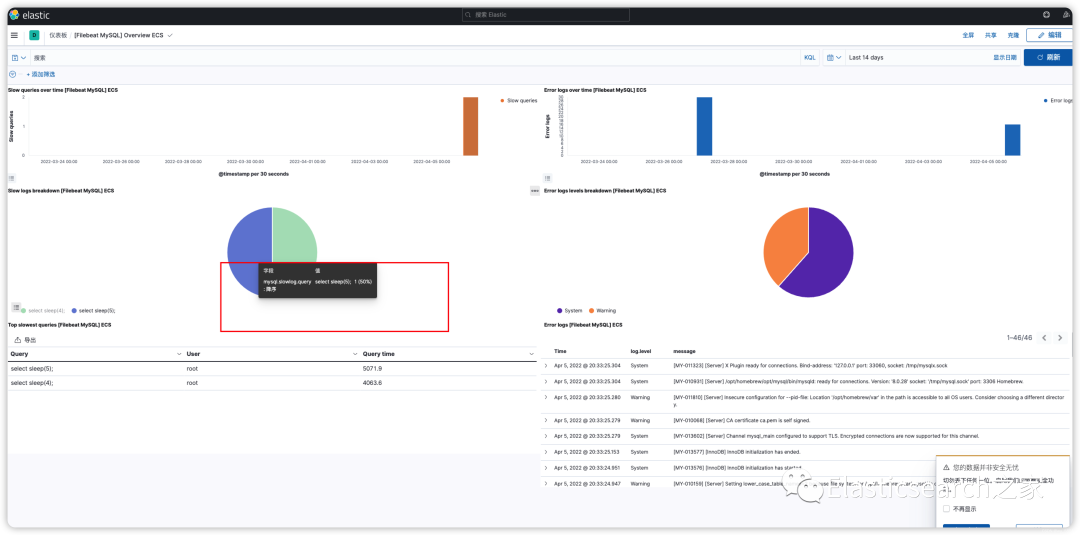 直接跳转到Filebeat MySQL数据看板。如果这里图形没有加载的话,检查一下filebeat-7.13.0索引是否有数据