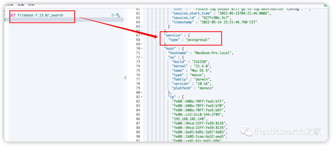 7、在kibana的dev-tool中查询filebeat-7.13.0索引,如果有索引且有postgresql数据则说明配置成功