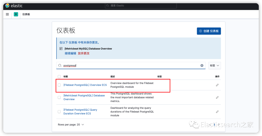 8、点击dashboard进入仪表盘页面,搜索postgresql,点击Overview ECS