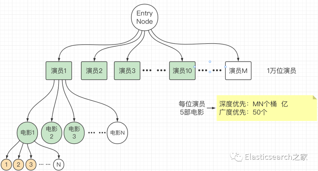 按照上述需求,我们最终要返回的桶数量最大值为 50。默认情况下,ES 会先构建完整的树,然后修剪无用节点。下图中表示即先遍历 演员1,然后遍历演员一的第一个分支,直至第一个分支没有子节点,回溯至演员一的第二个分支,直至遍历完演员1 的所有分支,回溯至Entry,然后遍历演员2。最终遍历节点数为 MN。如果演员数量有1万,平均每个演员10部电影,此时遍历所产生的的计算为10万次,而我们真正需要的只有50次!
