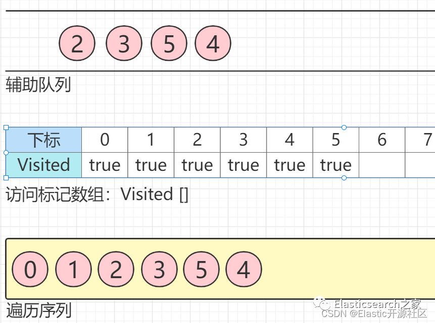 有四个邻接节点均已被访问,此时无节点入队列。同理,节点6、节点7