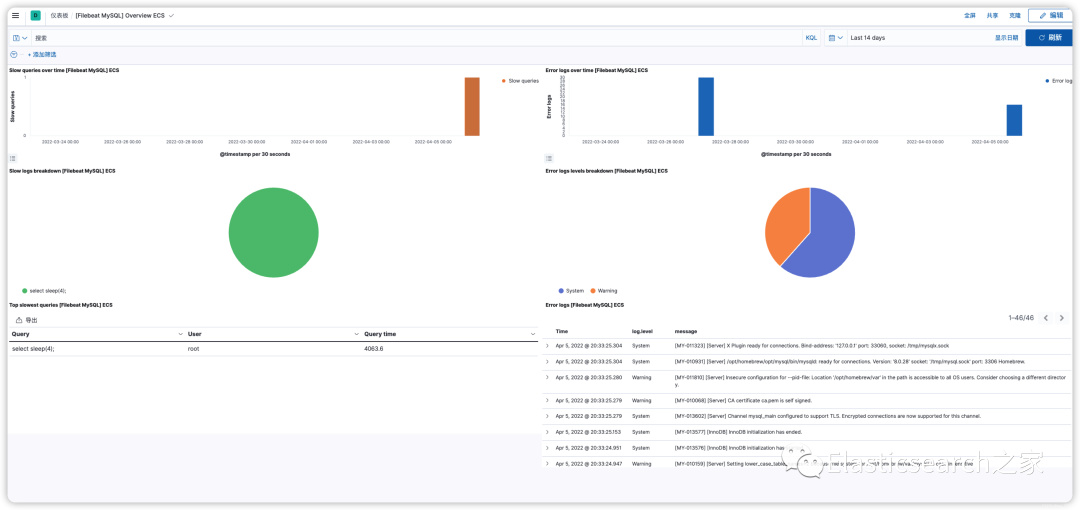 直接跳转到Filebeat MySQL数据看板。如果这里图形没有加载的话,检查一下filebeat-7.13.0索引是否有数据