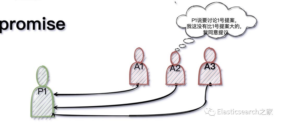 决策者A1,A2和A3收到P1的提议之后,A1发现自己这里的提案没有比1号提案更大的,于是他同意我们来进行讨论P1提出的一号提案,并且给了P1一个promise