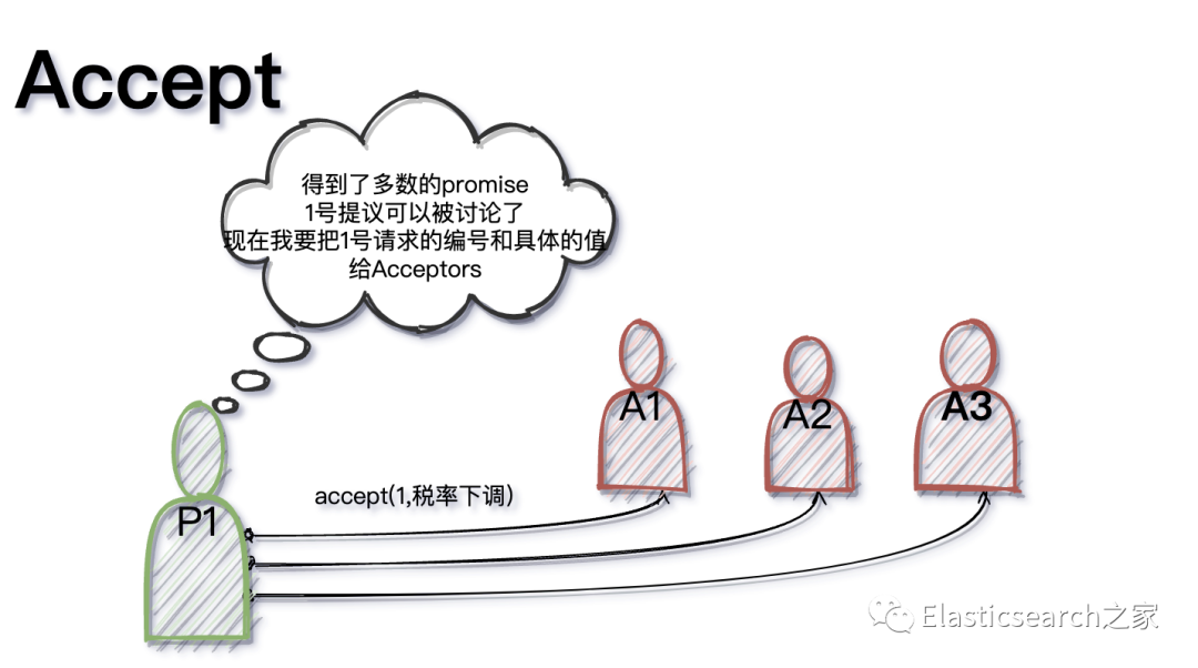 P1得到了足够的promise,可以向A1,A2,A3发送具体的提议内容了。P1高声的向A1,A2,A3三位大官人喊道:“我现在说的是编号为1号提议,提议的内容value是把税率下调”,A1,A2,A3虽然清晰的听到了提议编号和提议内容,但还是小心翼翼的看向了城主,毕竟税率这个问题,还是下他们一激灵。
