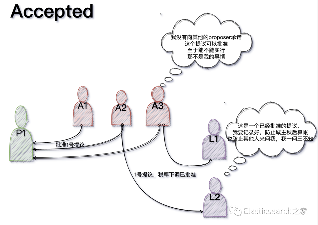 A1,A2,A3收到了提案的具体内容,并且发现并不违背自己和其他人的约定,于是批准通过了这个提议。就算A3有点怨言,不想下调税率,影响他的灰色收入,但是没有办法,A1,A2已经同意了,根据Paxos一直的多数原则,这个提议也是被批准的。