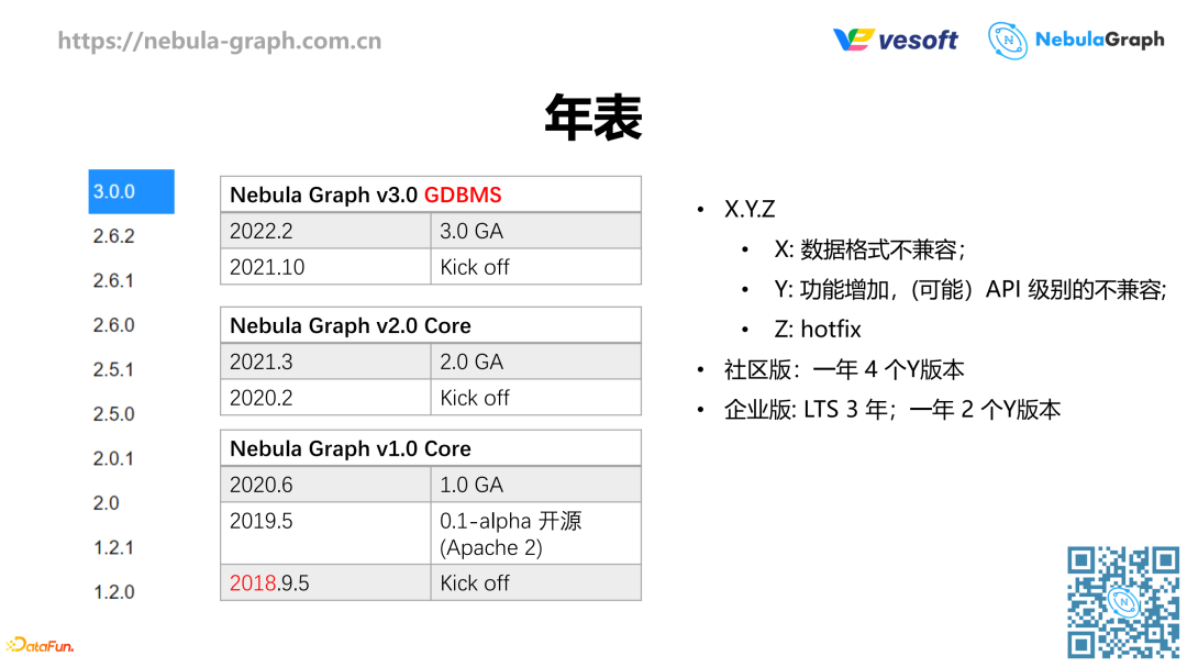 Nebula 的项目是2018年9月份启动的, 分别在2020、2021、2022年发布了三个主要版本,三个版本之间数据格式不兼容,在版本号上有明确的体现。目前社区版本一年发布四个,企业版本一年发布两个,企业版将获得 LTS (Long Term Support)长期支持三年。