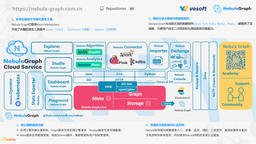 左侧是云服务和一些可视化的工具;中间是一些 Client SDK 和与各个大数据套件的打通工具 比如主流的 Spark、Flink 和 Kafka 的 Connector,以及图计算工具的 Connector;右边是一些用于存储、备份、多机房和测试的工具;最右边黄色的框是 Nebula Graph 提供的大学、文档,还有各种社区支持和商业支持。