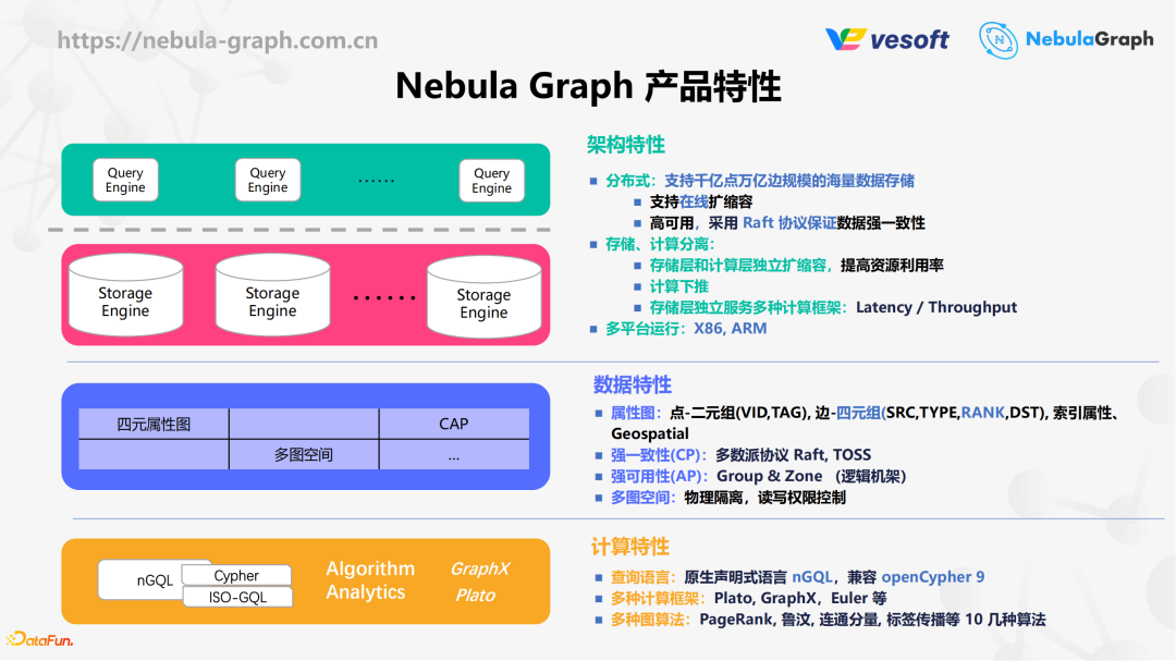 分布式,目标规模是千亿点万亿边,支持在线扩缩容。存储方面采用Raft协议保证多副本一致性,存储节点和计算节点分离,可以独自扩缩容。支持X86和ARM 多平台运行。