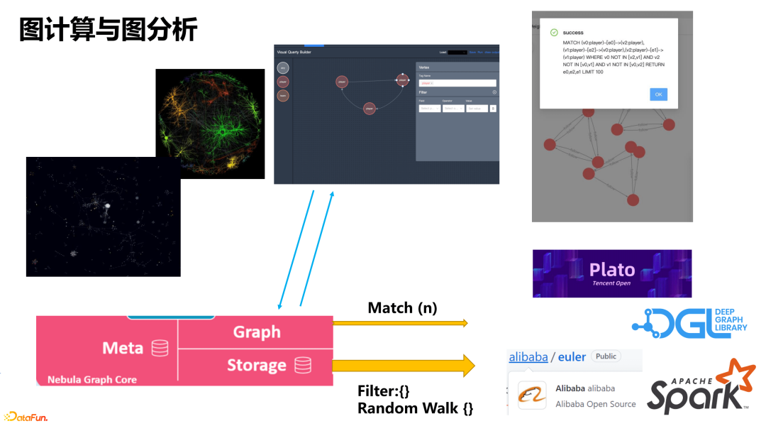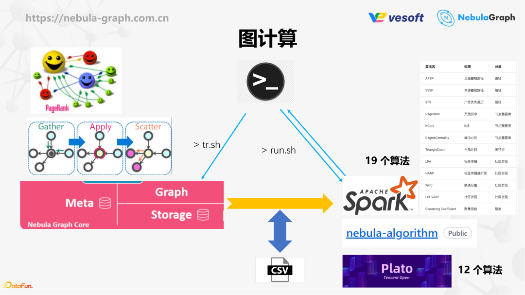 整个 Nebula 的图计算通过把 Nebula 内核的数据以一定的方式(以前是通过 CSV, 现在可以通过 API)接入第三方的计算引擎,如 Plato、GraphX、Euler 等来实现。目前需要用脚本和命令行的方式串起来,在 4.0 版本希望能更流畅一点。