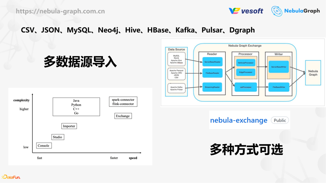 Nebula Exchange 支持的数据源一直在增加,Exchange 和 Importer(单机)可以覆盖大多数导入场景, 导入的速度和复杂度如上图所示。