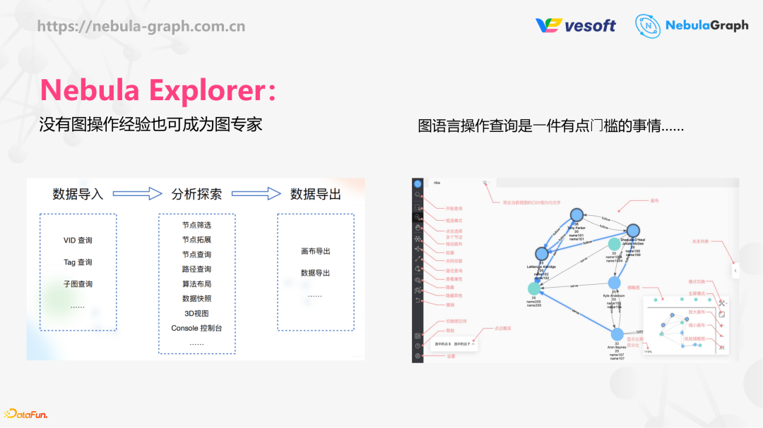 图很吸引人的一点就是它很直观。今年另外两个团队在干两件事,一是对于可视化方面做一些优化和尝试,包括前段时间已经发布的 3D 可视化的预览,以及大图进行可视化展示,包括:鸟瞰、亿级别图的鸟瞰。还有图分析,这个和 Nebula Explorer 接近,它的设计初衷是希望用户可以不用自己去写Cypher,只要通过一些拖拉拽去拼算子,拼出来一个基本的Cypher,这是可视化部分的工作。