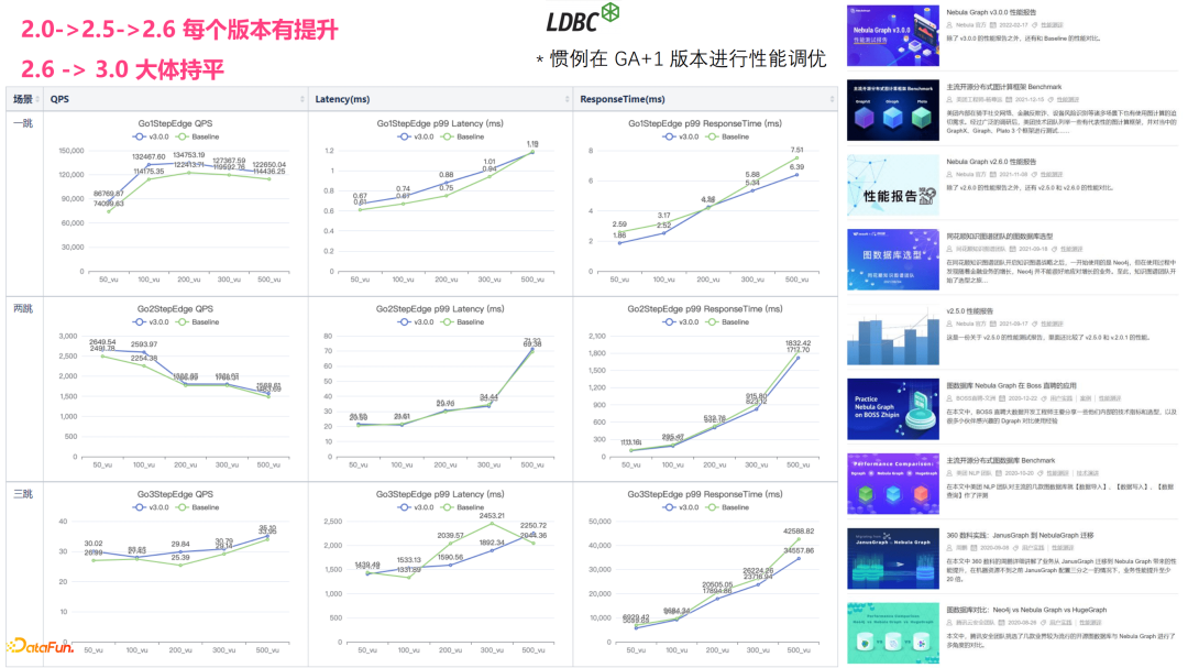 3.0版本相比 2.6 性能大体持平,预计 3.1 版本会对性能有优化,论坛(https://discuss.nebula-graph.com.cn/)中可以找到很多官方、其他厂商和开发者做的测试。