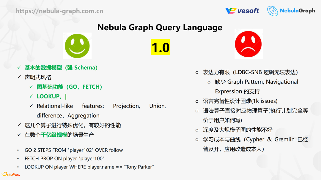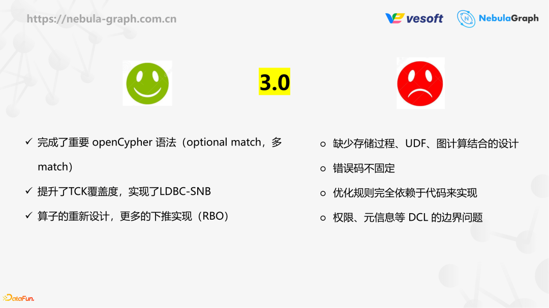 下面是 Nebula 三个版本图语言演进过程中实现的功能和存在的问题。