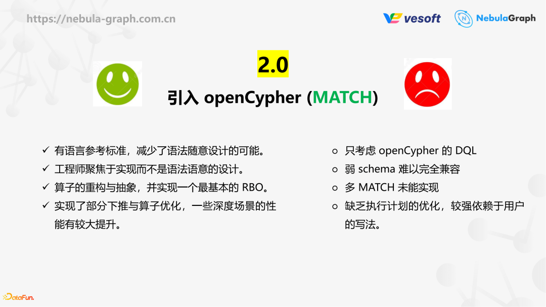 算子:统一算子,nGQL与openCypher共享物理算子;实现了更多 RBO 规则和下推方式。